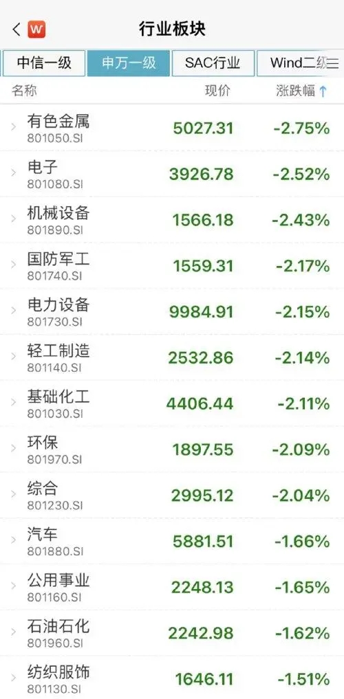 板块方面,申万一级行业指数除了食品饮料外全部下跌,有色、电子、机械设备、国防军工、电力设备跌幅居前,银行、商贸零售、传媒相对抗跌。