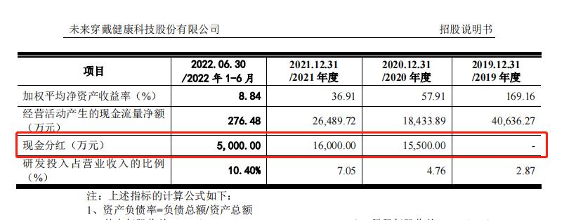 最先令人担忧的是未来穿戴的在上市前的高分红现象,根据招股说明书显示,2020年到2022年6月末,未来穿戴进行5次分红,金额分别为5,500万元、10,000万元、6,000万元、10,000万以及5,000万元,占当期净利润的比重分别为83.13%、102.89%、86.07%。