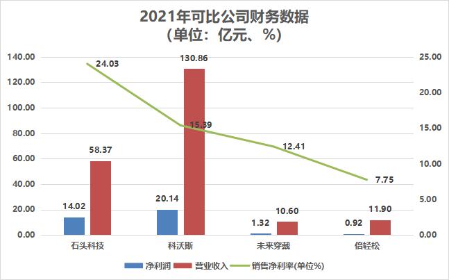 从高管主要考核指标来看,未来穿戴考核指标并无多优秀。2021年未来穿戴营业收入在倍轻松、科沃斯(603486)、石头科技同行公司中排名垫底,连科沃斯营业收入一成都未达到;在如此低的营业收入下,其销售净利率仍低于科沃斯与石头科技。
