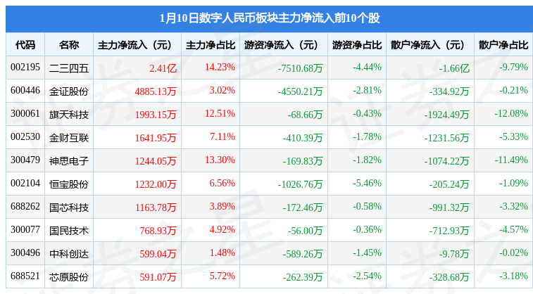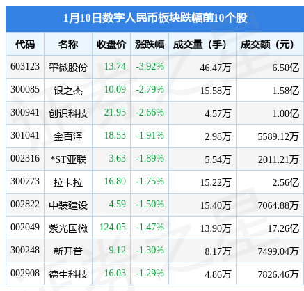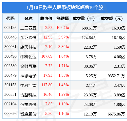 1月10日数字人民币板块较上一交易日上涨0.0%,二三四五(002195)领涨。当日上证指数报收于3169.51,下跌0.21%。深证成指报收于11506.79,上涨0.49%。数字人民币板块个股涨跌见下表: