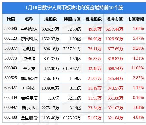 北向资金方面,当日数字人民币板块北向资金持股市值为143.53亿元,减持0.66亿元。其中增持最多的是中科创达(300496),增持了0.53亿元。减持持最多的是金证股份(600446),减持了0.53亿元。数字人民币板块北向资金持股变动明细见下表: